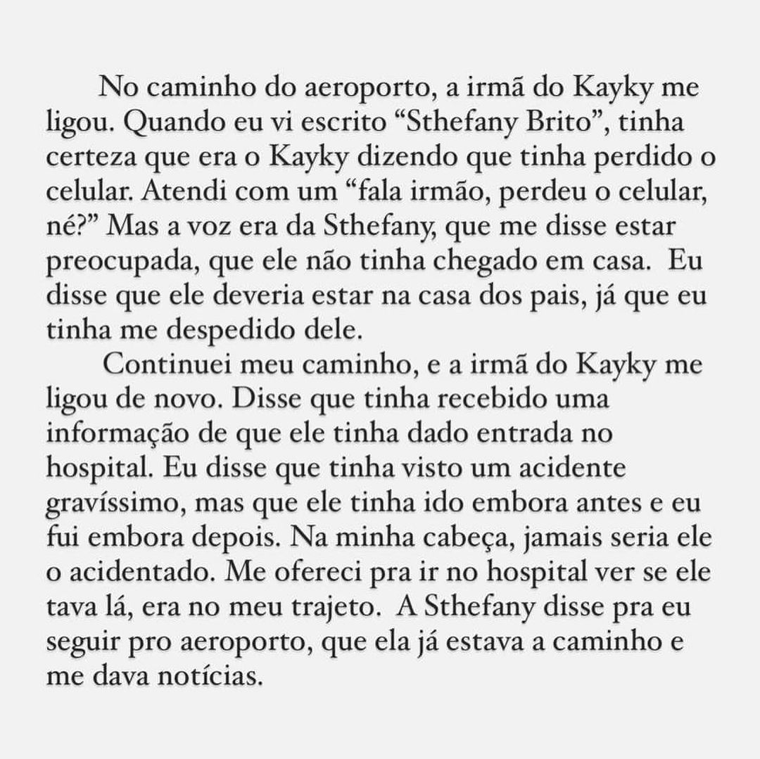 "Continuei meu caminho, e a irmã do Kayky me ligou de novo. Disse que tinha recebido uma informação de que ele tinha dado entrada no hospital. Eu disse que tinha visto um acidente gravíssimo, mas que ele tinha ido embora antes e eu fui embora depois. Na minha cabeça, jamais seria ele o acidentado. Me ofereci pra ir no hospital ver se ele tava lá, era no meu trajeto. A Sthefany disse pra eu seguir pro aeroporto, que ela já estava a caminho e me dava notícias".