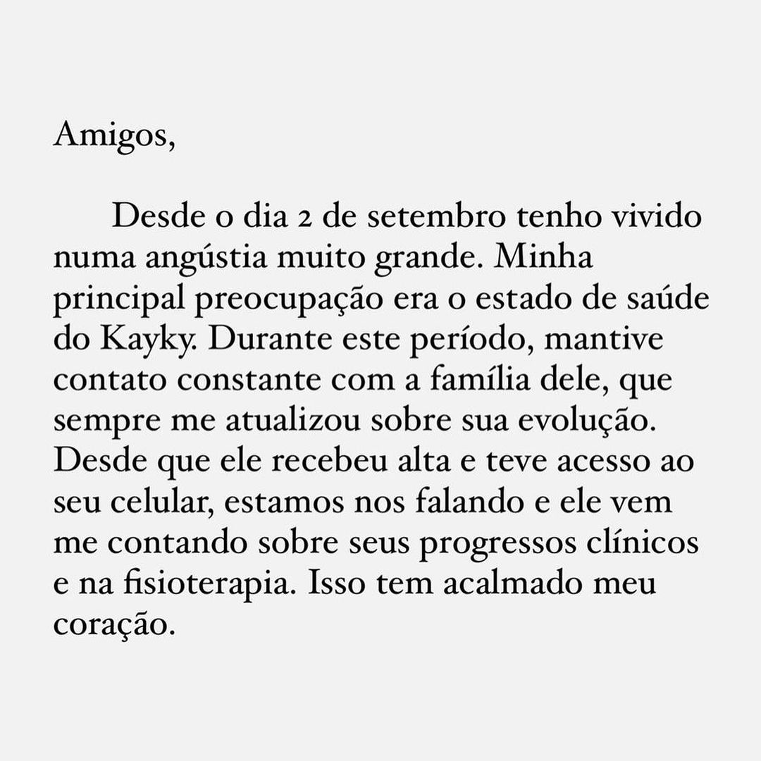 "Desde o dia 2 de setembro tenho vivido uma angústia muito grande. Minha principal preocupação era o estado de saúde do Kayky. Durante este período, mantive contato constante com a família dele, que sempre me atualizou sobre sua evolução. Desde que ele recebeu alta e teve acesso ao seu celular, estamos nos falando e ele vem me contando sobre seus progressos clínicos e na fisioterapia. Isso tem acalmado meu coração."