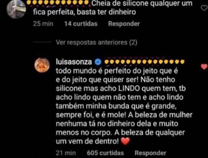 À mostra em um look neon, o atributo da cantora roubou toda a cena e levantou suspeitas de internautas que acreditaram que ela teria colocado silicone. Mas Luísa, que desde sempre tem o bumbum grande, explicou que é tudo natural ao responder um dos comentários, dizendo ainda que tem a bunda "grande e mole". A cantora, por sinal, não tem silicone nem nos seios, ao contrário de muitas famosas.
