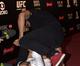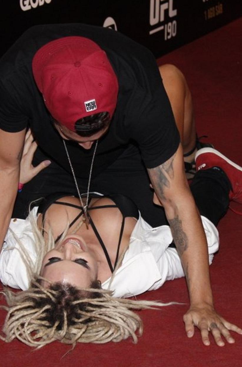 A modelo foi clicada enquanto brincava de luta com Caio Castro no tapete vermelho do UFC 190, o que rendeu vários clicks em poses indiscretas. O ator global entrou a fundo no clima de zoação do programa e ainda deu uma 'chave de braço' na loira. Será que Maria Casadevall, namorada do ator, vai ficar com ciúmes?