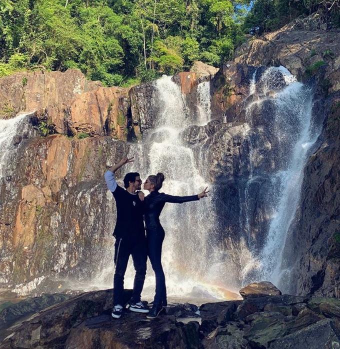 Ao chegar ao destino, Grazi publicou uma foto com o ator em uma cachoeira.