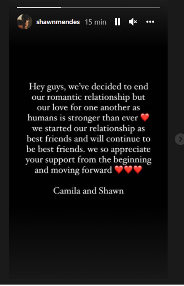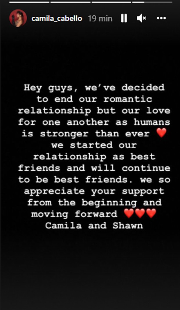 "Olá, pessoal. Decidimos terminar nosso relacionamento amoroso, mas nosso amor um pelo outro como humanos está mais forte do que nunca. Começamos nosso relacionamento como melhores amigos e continuaremos a ser melhores amigos. Agradecemos o apoio de todos desde o início e no futuro. Camila e Shawn", dizia o comunicado.