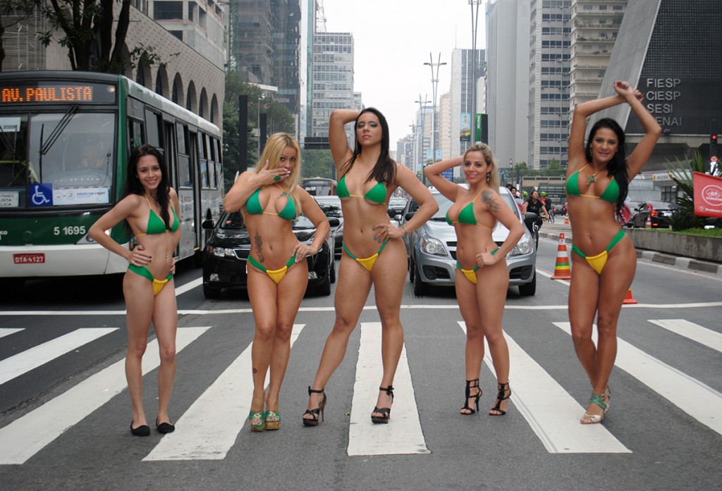 As gatas colocaram seus biquínis fio-dental nas cores brasileiras e passearam pela Avenida Paulista, deixando os pedestres e motoristas boquiabertos.