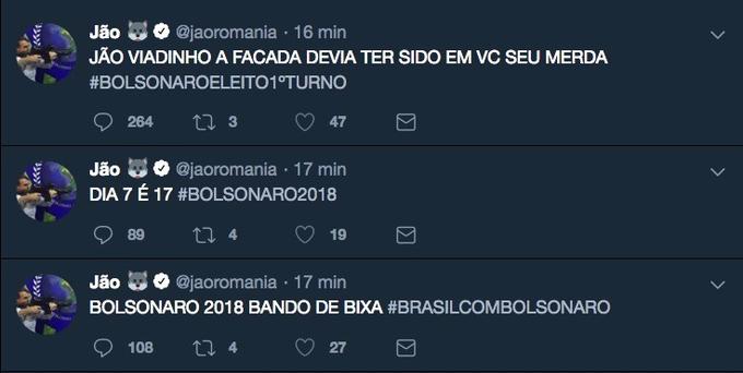 No perfil, os hackers têm colocado mensagens homofóbicas e pró-Bolsonaro. Em um dos posts, diz que Jão era quem deveria ser esfaqueado no lugar do candidato à presidência.