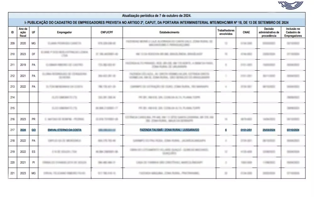 A relação com o nome de 176 empregadores, entre eles Emival Eterno da Costa, nome de batismo de Leonardo, foi atualizada nesta segunda-feira (7). Segundo o relatório do MTE, seis trabalhadores eram submetidos a condições análogas à escravidão na Fazenda Talismã.