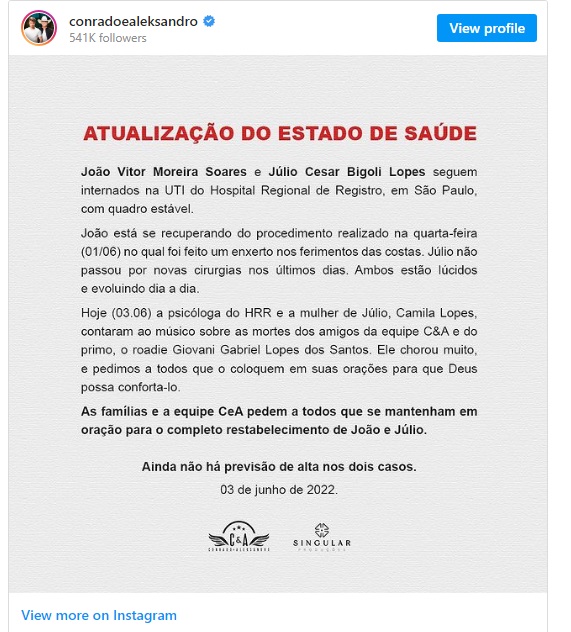 O cantor sertanejo Conrado, que estava no acidente de ônibus que matou o parceiro Aleksandro em 7 de maio, passou por uma cirurgia quase um mês após o ocorrido. Ele segue internado com quadro estável.