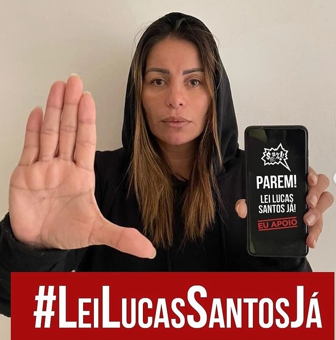 "Agora eu preciso do apoio de cada um de vocês para que essa lei seja aprovada e possamos salvar vidas. Demonstre seu apoio a essa causa publicando uma foto como essa minha. A mão com sinal de pare e ao mesmo tempo fazendo um L, para que parem de fazer o que fizeram com meu filho. A imagem para ser utilizada no celular estará em meu stories. Comentem onde vocês puderem para que essa lei seja aprovada. Eu vou lutar até o fim! #LeiLucasSantosJá”, escreveu.
