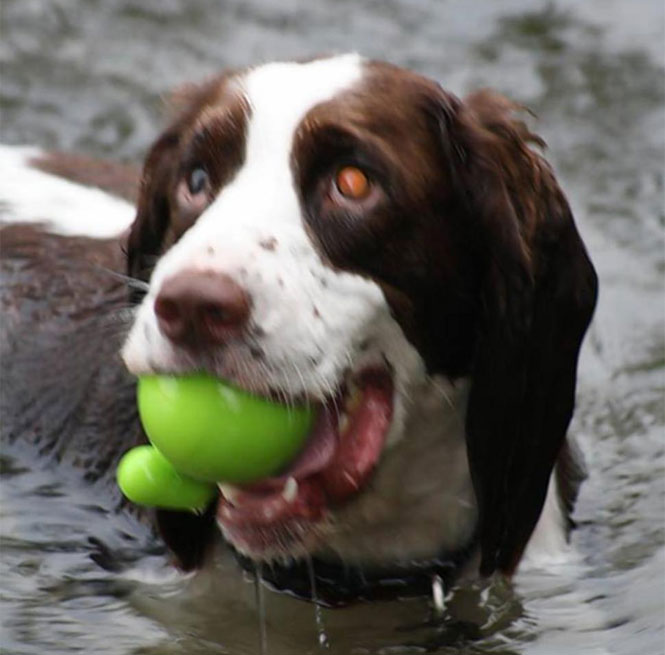 Marcy Stapley, de Petersburgo, Ontário, afirmou que, apesar da cegueira, o animal não perdeu seus instintos básicos. Ele vive constantemente correndo atrás de coisas e adora brincar com seus companheiros caninos.