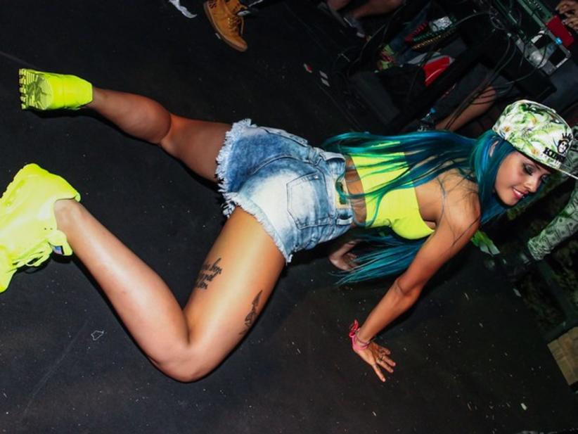 De short curtinho, Tati Zaqui se empolgou durante show e levou os fãs à loucura ao fazer uma coreografia ousada. A funkeira, que é capa da Playboy, ficou de quatro e até deu beijo na boca de um fã durante o evento.