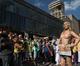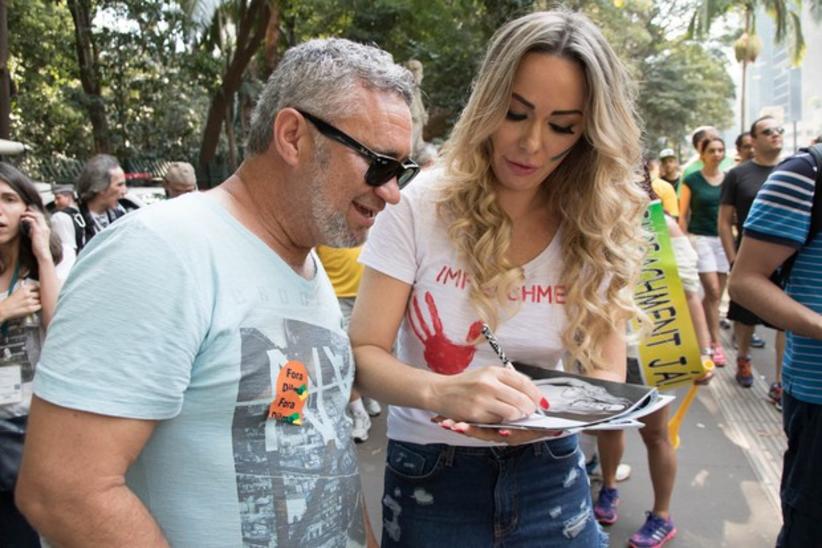 A gata, que é capa da “Sexy”, não se intimidou e tirou a camisa em meio os manifestantes. Enquanto algumas pessoas tiravam fotos, Ju exibia as páginas da revista.