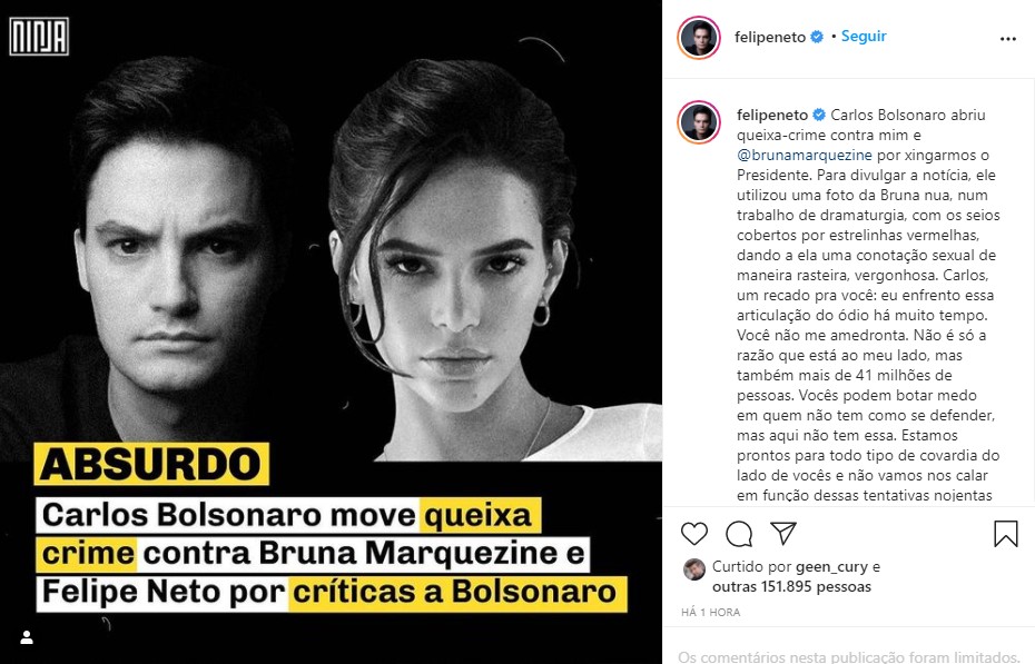 "Carlos Bolsonaro abriu queixa-crime contra mim e Bruna Marquezine por xingarmos o Presidente. Para divulgar a notícia, ele utilizou uma foto da Bruna nua, num trabalho de dramaturgia, com os seios cobertos por estrelinhas vermelhas, dando a ela uma conotação sexual de maneira rasteira, vergonhosa", disparou o youtuber.