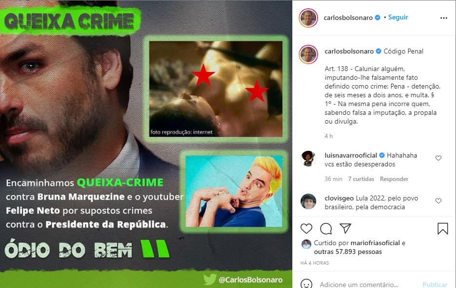 O vereador Carlos Bolsonaro anunciou nesta quinta-feira (11) que abriu uma queixa-crime contra o youtuber Felipe Neto e a atriz Bruna Marquezine, os acusando de difamação contra seu pai, Jair Bolsonaro, após posts criticando o presidente nas redes sociais.
