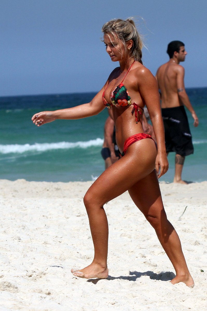 Carol Guarnieri aproveitou o final de semana para curtir a praia de Ipanema, no Rio de Janeiro, e não teve pena dos cardíacos presentes no local. Já não bastasse as curvas perfeitas da loira, a modelo e apresentadora do Multishow e neta de Francesco Guarnieri, ainda usou um micro biquíni para dourar a pele nas areias cariocas.