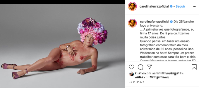 As imagens foram captadas pelas lentes do fotógrafo Bob Wolfenson. Na publicação, Carolina Ferraz elogiou o trabalho do profissional e comentou sobre a chegada da nova idade.