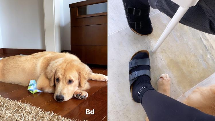 Já Bruna postou foto da patinha da sua cachorra, ao lado do seu pé e uma perna masculina sentada.