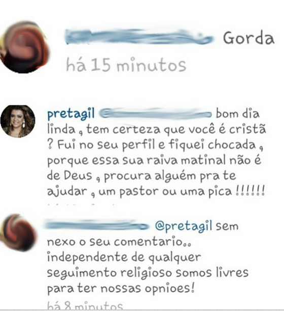 Educada, Preta iniciou: "bom dia linda, tem certeza que você é cristã? Fui no seu perfil e fiquei chocada, porque essa sua raiva matinal não é de Deus". Ao concluir o comentário, a cantora alfinetou: "procura alguém pra te ajudar, um pastor ou uma pica!!!!!!".