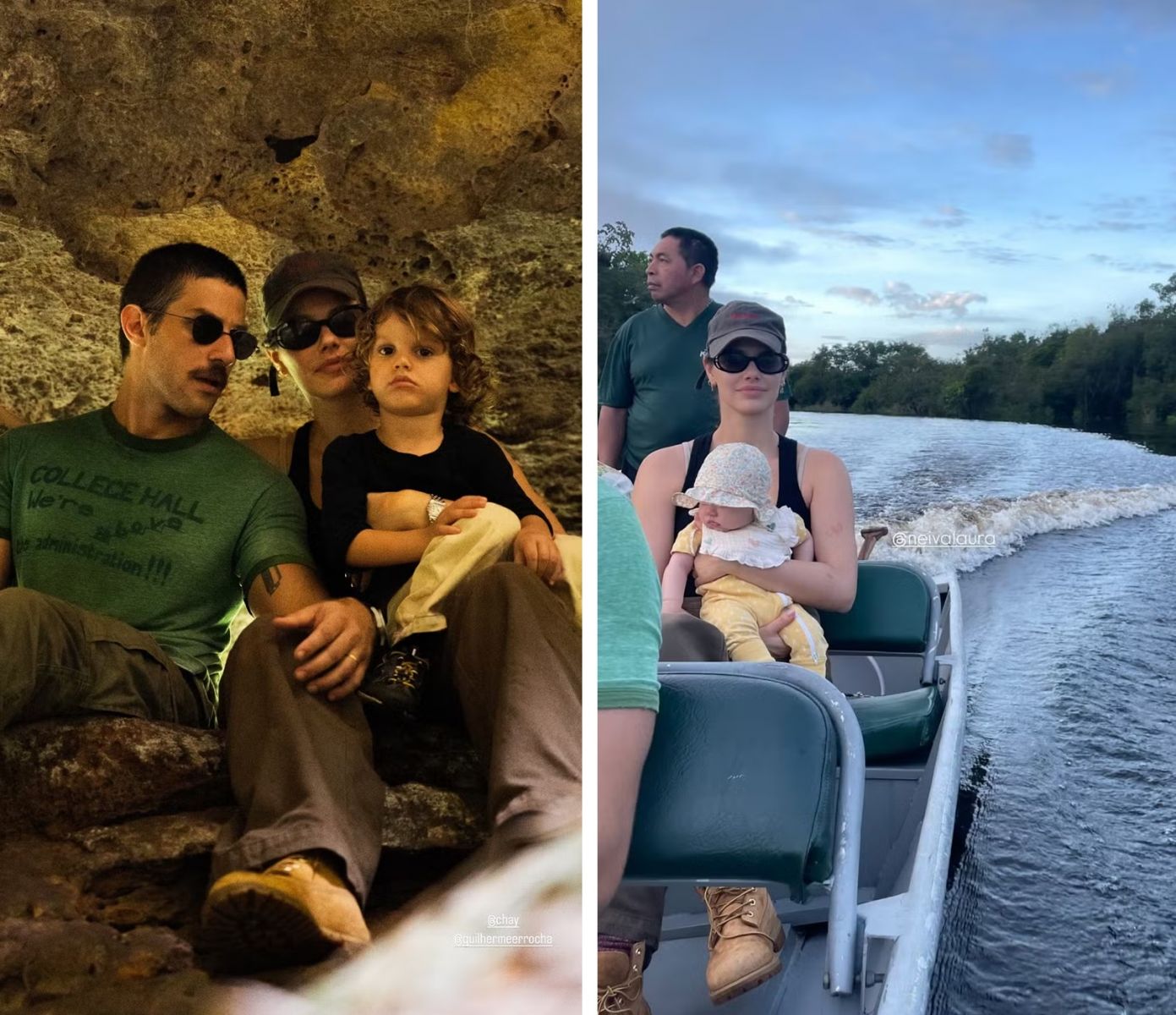Chay Suede e Laura Neiva compartilharam uma foto com direito a mão boba durante uma viagem que o casal está fazendo com os três filhos pelo Amazonas.