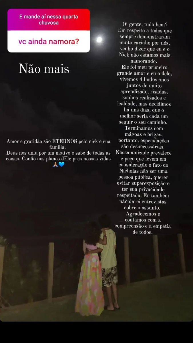 A atriz declarou que Nicholas foi o seu primeiro grande amor e pediu respeito pelo ex-namorado, que não é uma pessoa pública. O casal estava junto desde 2017