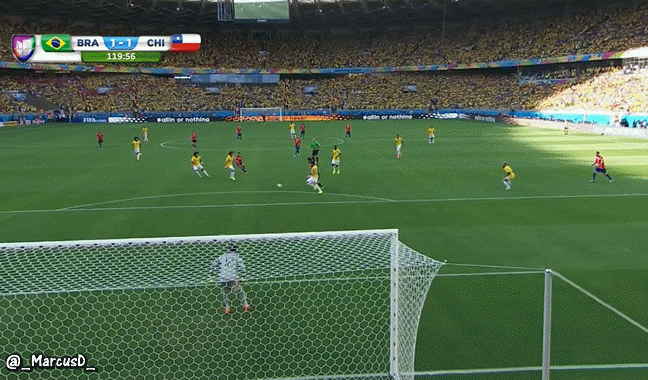 O atacante chileno Mauricio Pinilla chutou forte acertando o travessão do goleiro Júlio César aos 14 min do segundo tempo da prorrogação. “Se não fosse Deus, o Brasil estaria fora da copa depois dessa bola na trave!” afirmou um torcedor brasileiro e ateu, no Twitter. Caso tivesse sido gol, o Brasil teria feito sua pior campanha na história das Copas do Mundo.