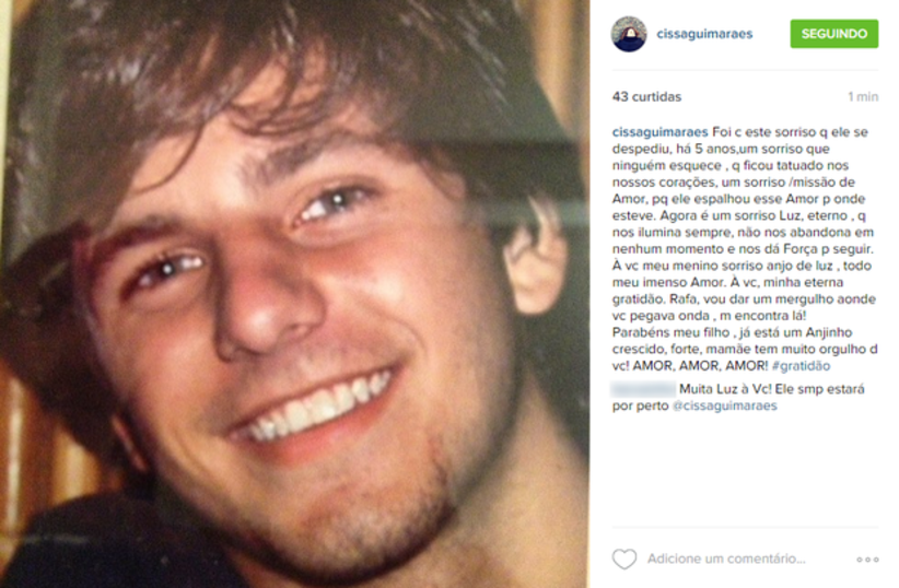 A atriz publicou uma foto de Rafael junto de um texto emocionant. "Foi com esse sorriso que ele se despediu há cinco anos. Um sorriso que ninguém esquece, que ficou tatuado nos nossos corações. Um sorriso / missão de amor, porque ele espalhou esse amor por onde esteve. Agora é um sorriso, luz eterna que nos ilumina sempre, não nos abandona em nenhum momento e nos dá força para seguir. A você, meu menino, sorriso anjo de luz, todo meu imenso amor. A você, minha eterna gratidão. Rafa, vou dar um mergulho onde você pegava onda. Me encontra lá! Parabéns, meu filho. Você já está um anjinho crescido, forte. Mamãe tem muito orgulho de você! Amor, amor, amor e gratidão”, escreveu.