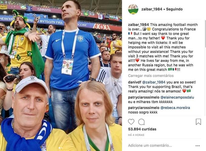 "Esse mês incrível de futebol acabou. (emoji de choro) Parabéns para a França. Mas eu quero dizer obrigado pra um grande homem... Meu pai! Obrigado por me ajudar com os ingressos. Seria impossível ir a todas essas partidas sem sua ajuda. Obrigado por ir a três partidas comigo! Obrigado por tudo! Ele mora longe de mim, em outra região da Rússia, mas ele estava comigo nessa partida incrível".
