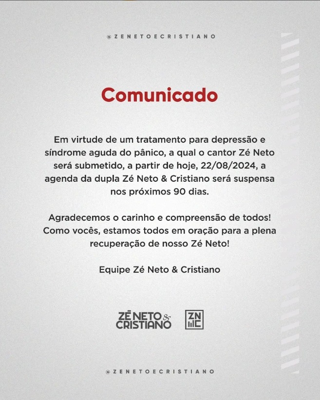 A dupla Zé Neto & Cristiano anunciou que vai suspender a agenda de shows, para Zé Neto tratar de um quadro de depressão e síndrome aguda do pânico.