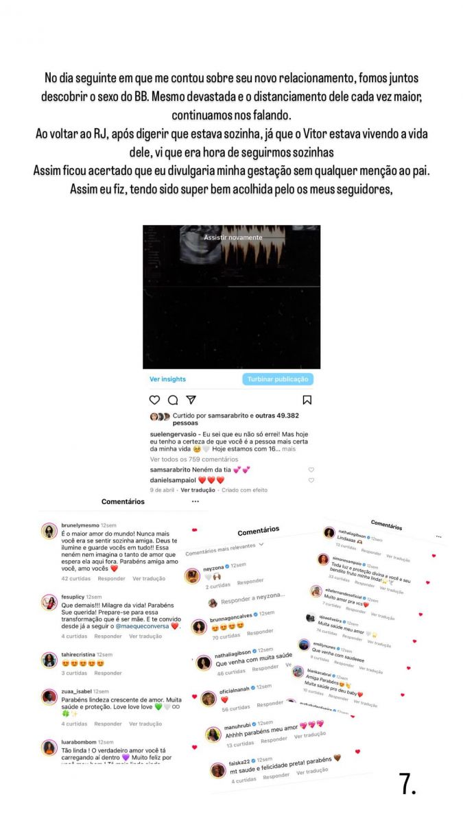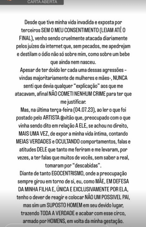 Suelen Gervásio, que está grávida de Vitão, abriu o jogo sobre a sua história na polêmica com o cantor, com quem passou a trocar farpas nos últimos dias e chegou a proibir de estar presente no momento do parto, devido à dúvida se ele irá assumir a criança. Leia na íntegra nas imagens publicadas no decorrer da matéria: