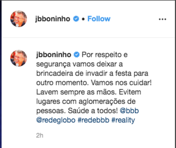 O diretor do reality usou as redes sociais, nesta quinta-feira (12) para anunciar a medida de precaução e fez um alerta ao público: ”Por respeito e segurança vamos deixar a brincadeira de invadir a festa para outro momento. Vamos nos cuidar! Lavem sempre as mãos. Evitem lugares com aglomerações de pessoas. Saúde a todos!”.