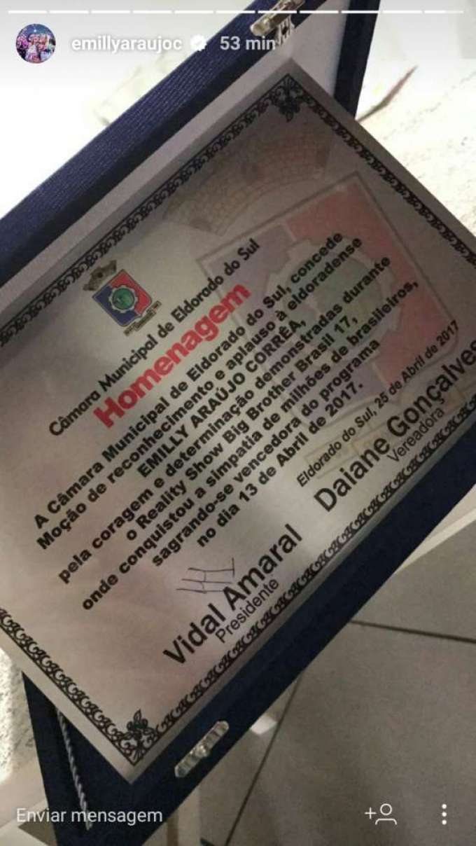 A ex-BBB Emilly Araújo foi homenageada nesta terça-feira (23) na Câmara Municipal de Eldorado do Sul pela “coragem e determinação” no Big Brother Brasil 17.