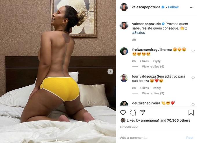 Nesta sexta-feira (17) a funkeira Valesca popozuda fez a alegria de seus seguidores ao postar uma foto só de calcinha em seu Instagram.