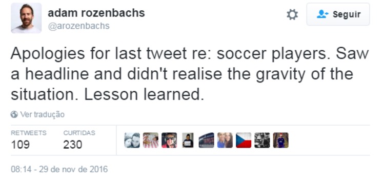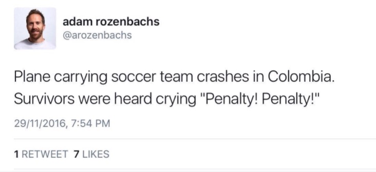 Com a repercussão mundial, Adam tuitou: “Avião carregando jogadores de futebol cai na Colômbia. Sobreviventes foram ouvidos gritando: 'Pênalti! Pênalti”.
