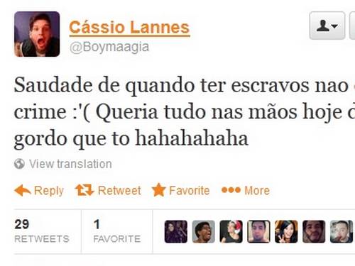 Cassio Lannes, integrante do BBB14 pode ser vetado de participar do programa. Acontece que o moço postou no Twitter (@Boymaagia) um comentário de mal gosto e racista sobre escravos que já rendeu dor de cabeça para o amigo azarado que resolveu cuidar da conta do cara.