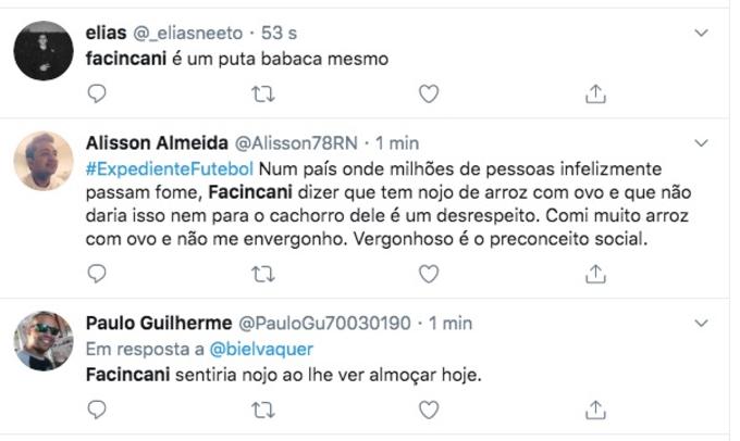 Colegas da bancada perceberam o comentário infeliz e tentaram impedi-lo de continuar, mas sem sucesso. Internautas detonaram a atitude, chamando o comentarista de "playboy preconceituoso" e colocando o nome de Fancicani nos trending topics do Twitter. Confira alguns dos comentários: