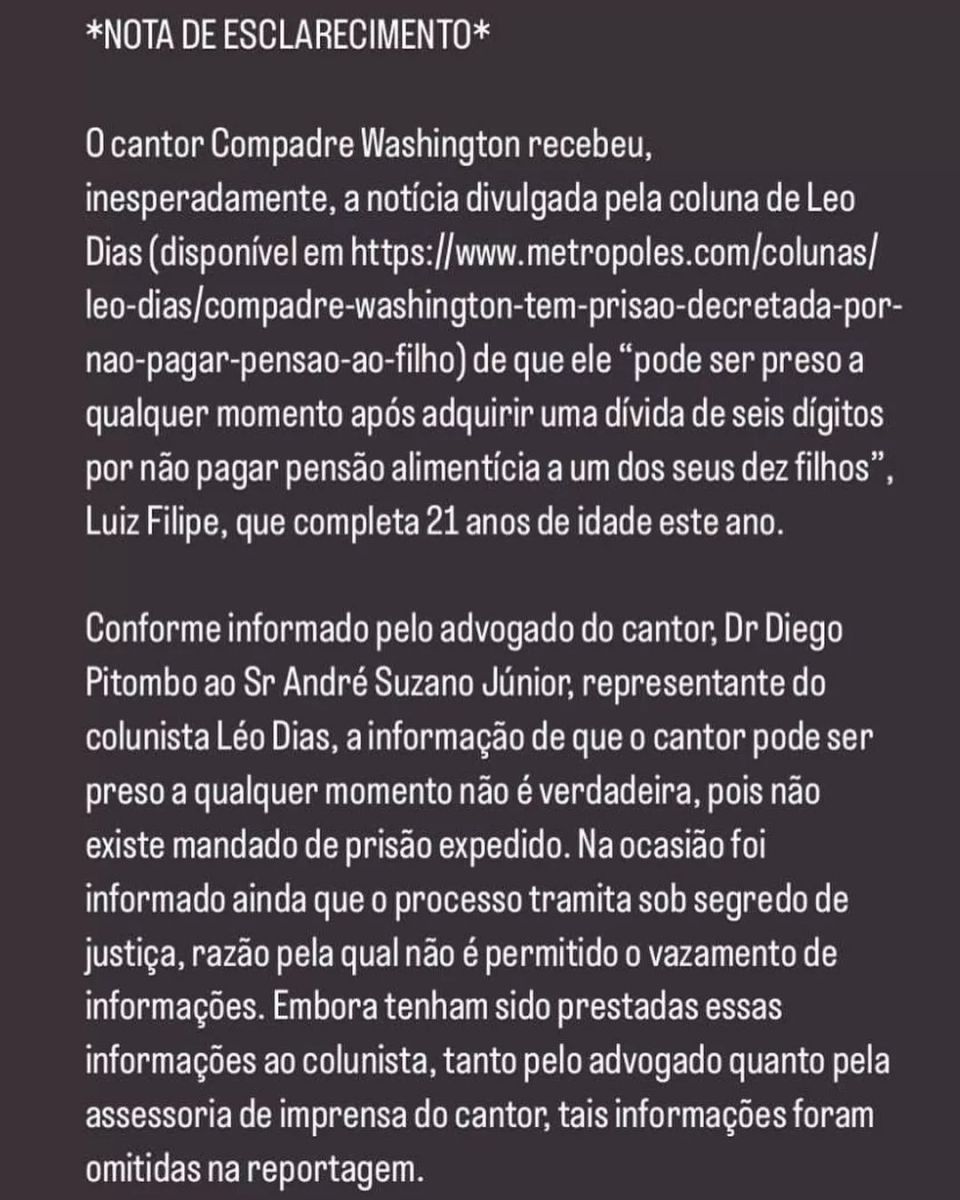Compadre Washington desmentiu a notícia publicada por Leo Dias neste sábado (4) de que poderia ser preso a qualquer momento por não pegamento de pensão alimentícia a um de seus 10 filhos.