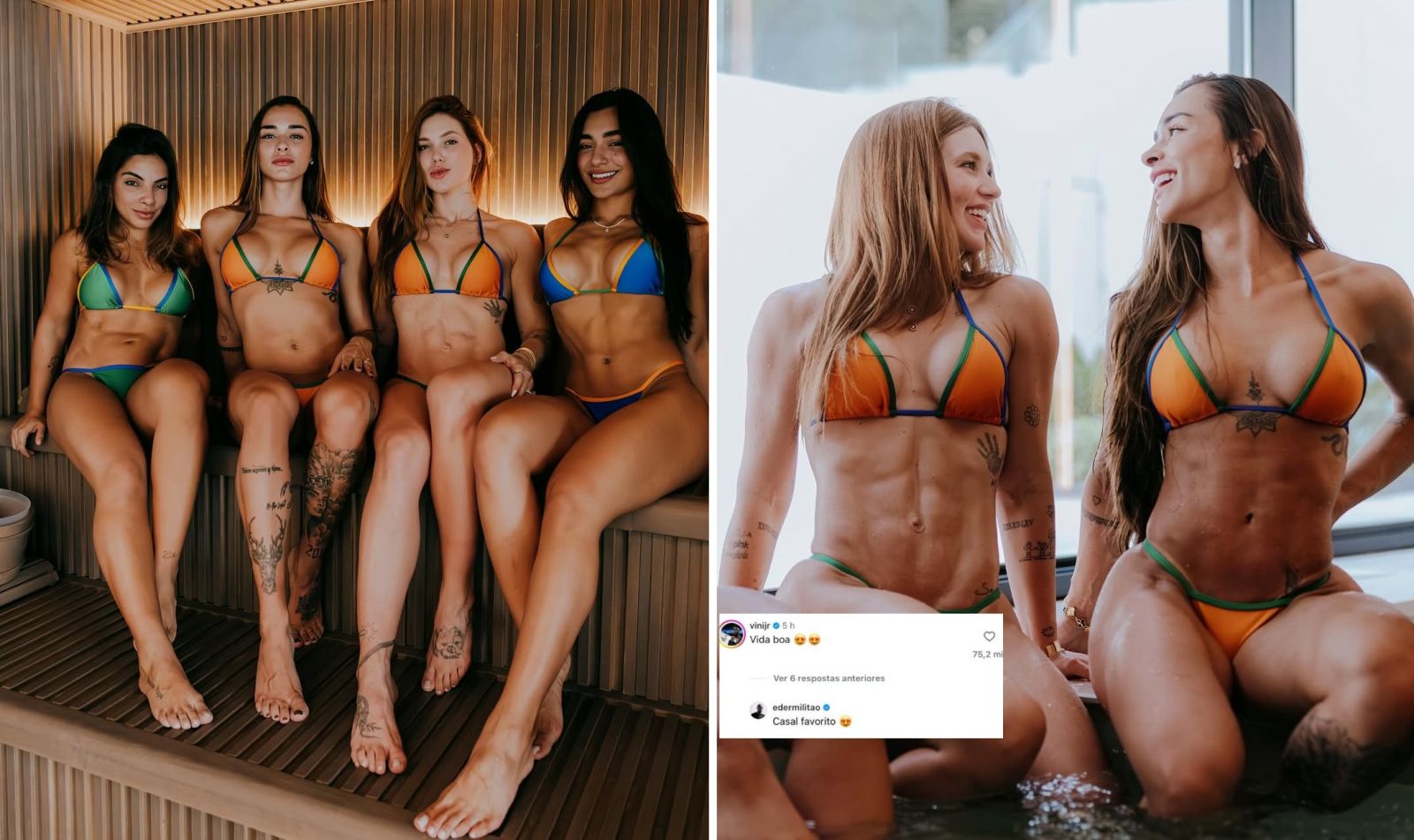 "Casal favorito", escreveu o jogador em um post de Virgínia, em resposta a um comentário de Vinicius que dizia "Vida boa". As fotos postadas por Virgínia mostravam ela de biquíni ao lado de Tainá Castro, casada com Éder, e das amigas Lidia Souza e Duda Freire.
