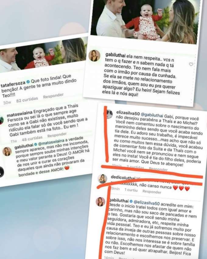 Depois, mais um comentário de Gabi sobre o assunto revelou a 'treta': "Ela nem respeita... vocês não tem o que fazer e não sabem nada que tá acontecendo. Teo nem fala mais com o irmão [Michel Teló] por causa da cunhada [Thaís Fersoza]. Se ela se mete no relacionamento dos irmãos, quem sou eu pra querer apaziguar algo? Eu hein! Sejam felizes eles lá e nos aqui!".