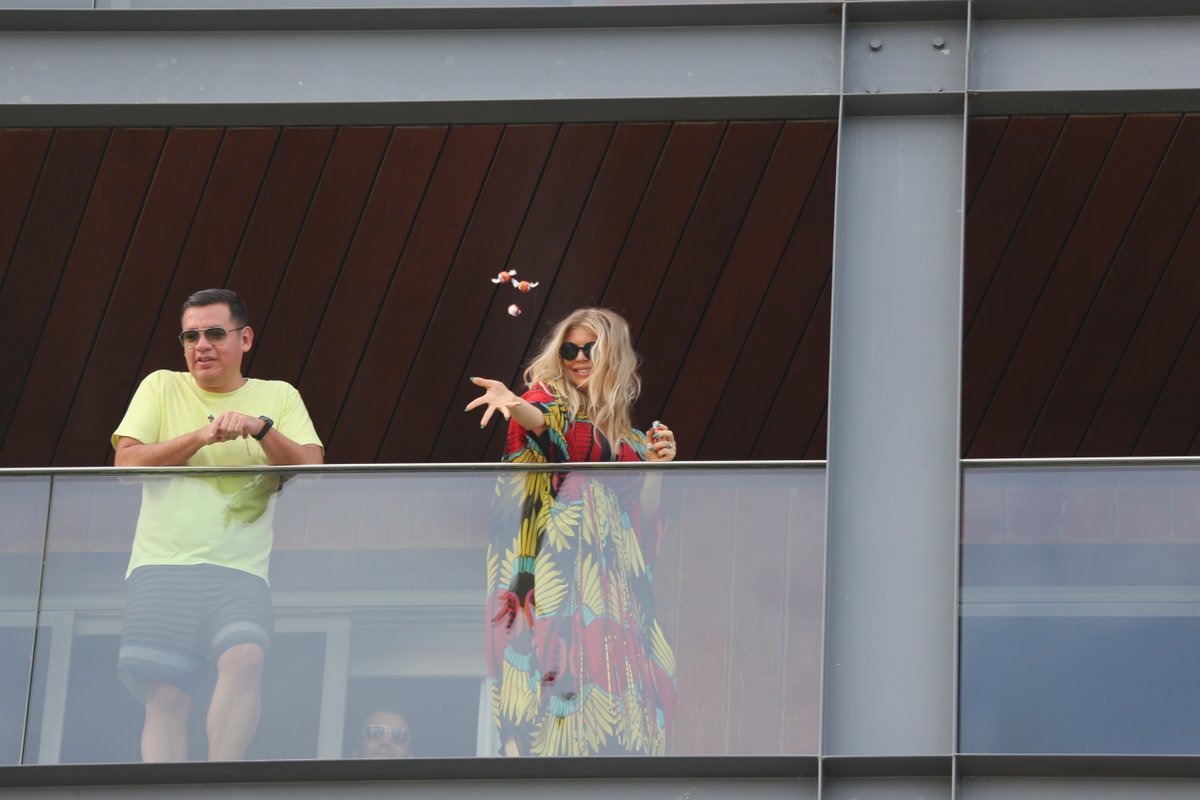 A ex-vocalista do Black Eyed Peas começou jogando uvas, e depois distribuiu bombons, lembrando a vinda de Lady Gaga, que ao trazer sua turnê para o país, distribuiu até pizza e hambúrguer.