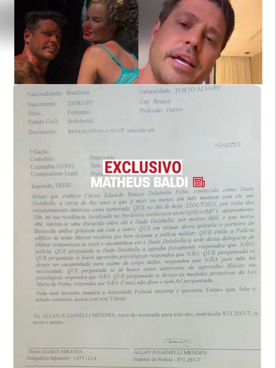 Segundo Baldi, o casal teve uma discussão acalourada no apartamento da modelo, em Ipanema, no Rio de Janeiro, neste sábado (25). Vizinhos teriam escutado o conflito e o porteiro do prédio acionou a polícia.