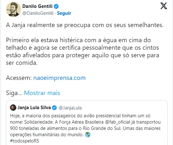 O apresentador do programa The Noite, Danilo Gentili, criticou a primeira-dama Janja por publicar uma foto nas redes sociais, nesta quarta-feira (15/05), em que aparece posando ao lado de várias cestas básicas em uma aeronave da Força Aérea Brasileira (FAB).