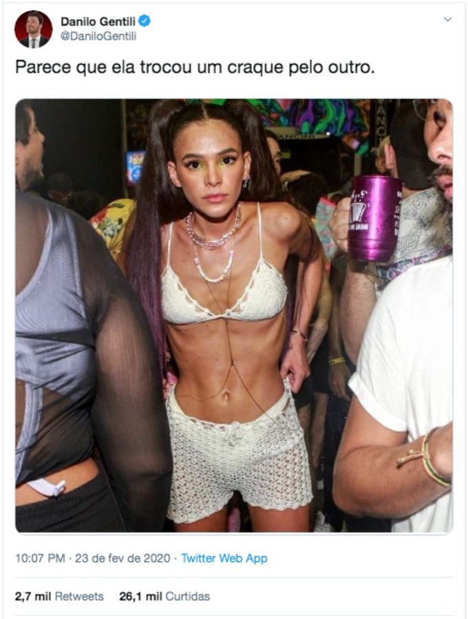 O humorista Danilo Gentili criticou o corpo da atriz Bruna Marquezine em seu perfil no Twitter, neste domingo (23) e foi detonado pelos internautas.