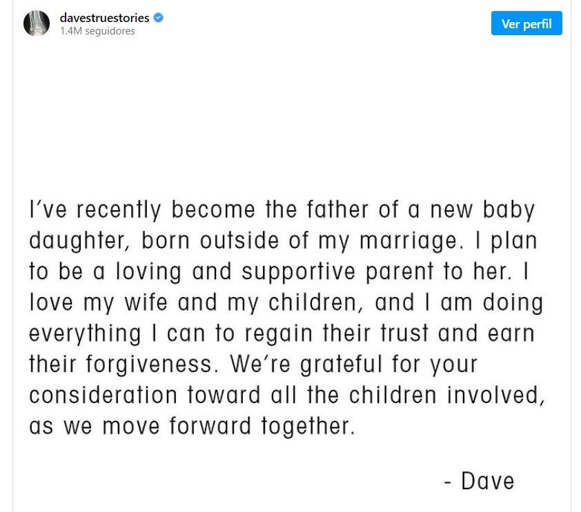 Ele finalizou fazendo um pedido de perdão público à esposa, com quem já tem três filhos, e com quem está junto há 21 anos. "Eu amo minha mulher e minhas filhas, e vou fazer de tudo para reconquistar sua confiança e merecer seu perdão. Estamos gratos pela compreensão em relação a todas as crianças envolvidas, conforme caminhamos em frente juntos.".