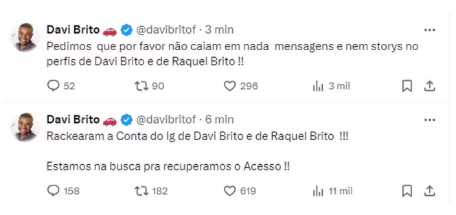 "Pedimos que por favor não caiam em nada, mensagens e nem stories nos perfis de Davi Brito e Raquel Brito. Estamos na busca para recuperarmos o acesso.", escreveu.