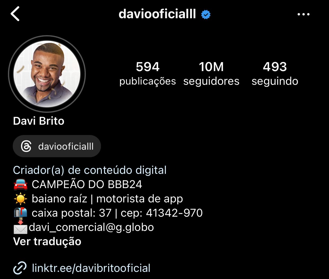 No Instagram, até ontem, Davi tinha 10,5 milhões seguidores, no entanto, hoje (21), o número caiu para 10 milhões.