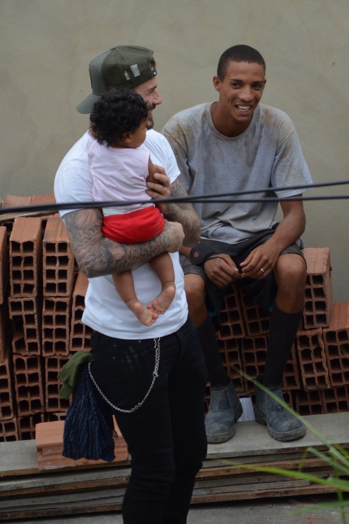David Beckham visita a comunidade do Vidigal, no Rio, conversa com os moradores e ainda paparica uma criança ao posar para foto.