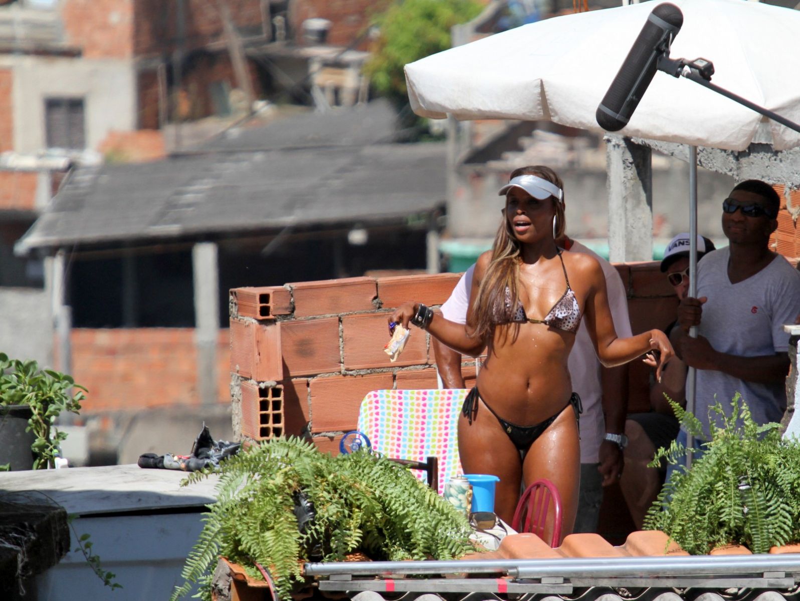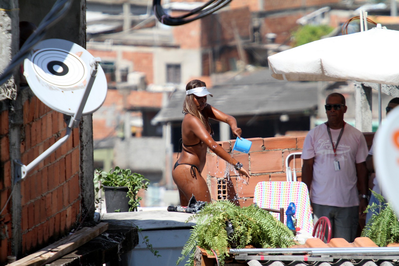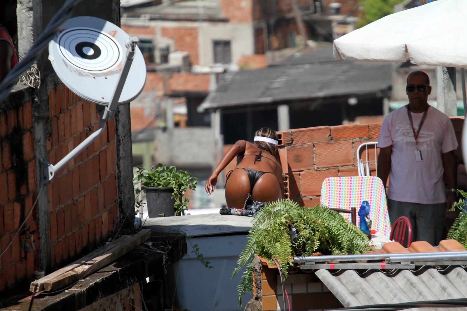 Em "Salve Jorge", Maria Vanúbia só quer saber de se bronzear na laje. Na tarde desta terça-feira (5), Roberta Rodrigues gravou uma cena da novela das nove, usando biquininho e passando bronzeador em uma laje do Complexo do Alemão.