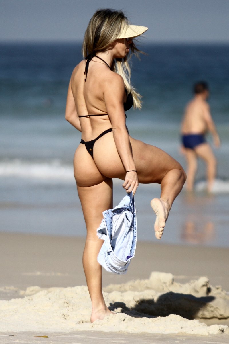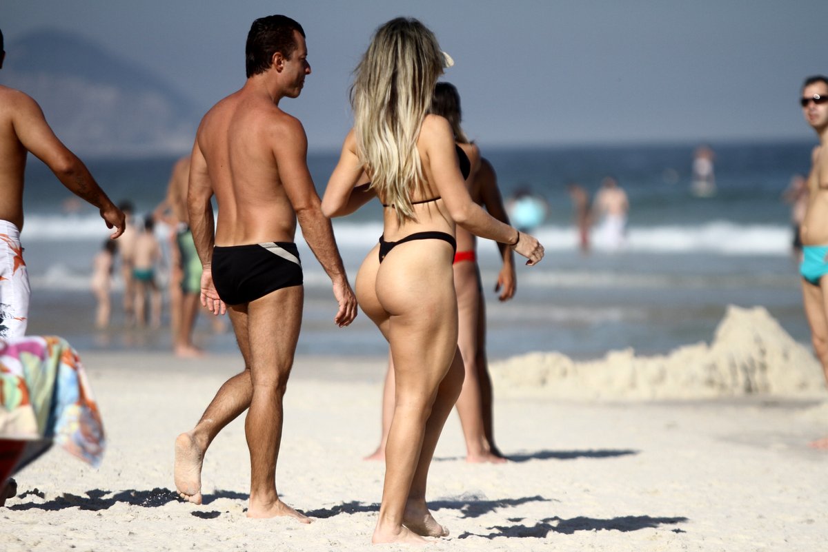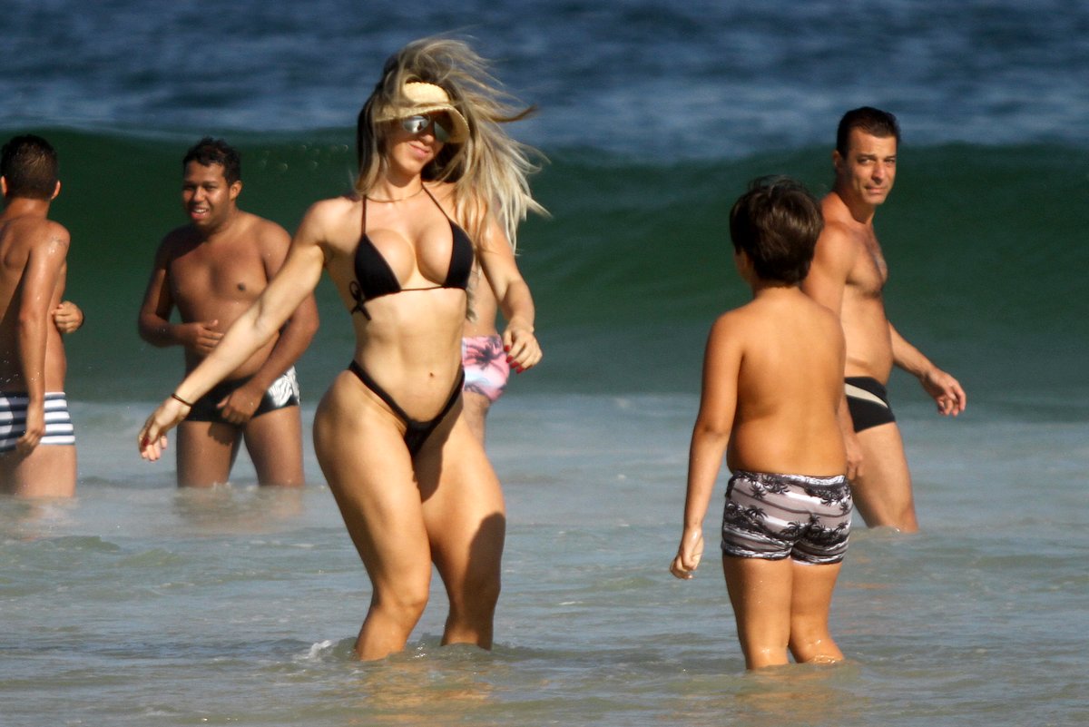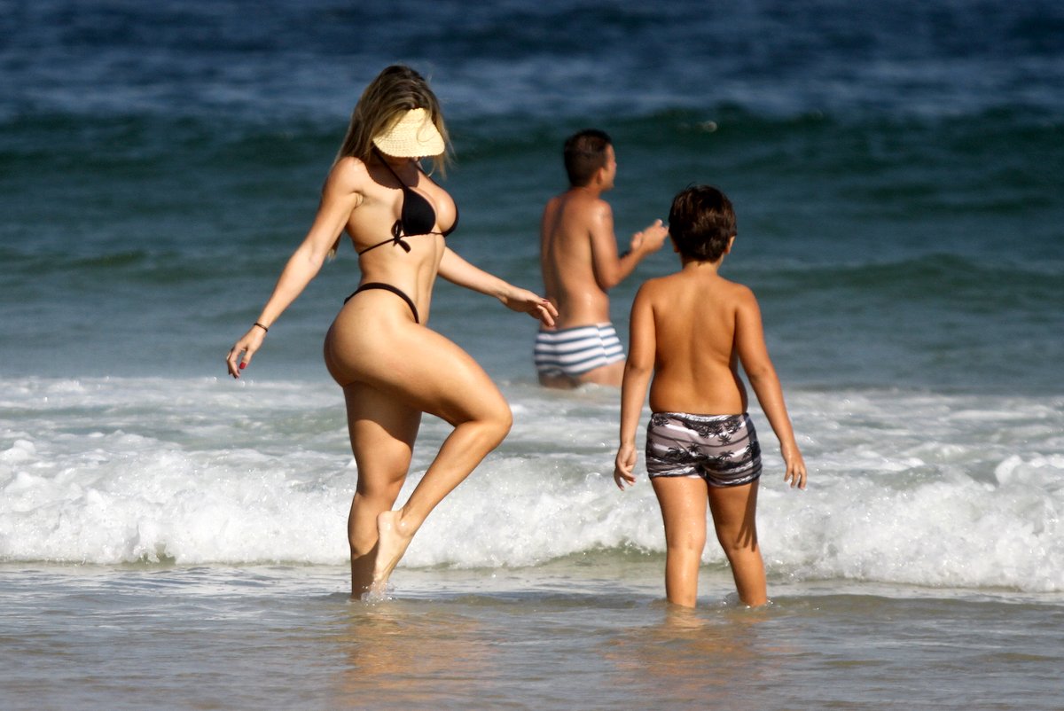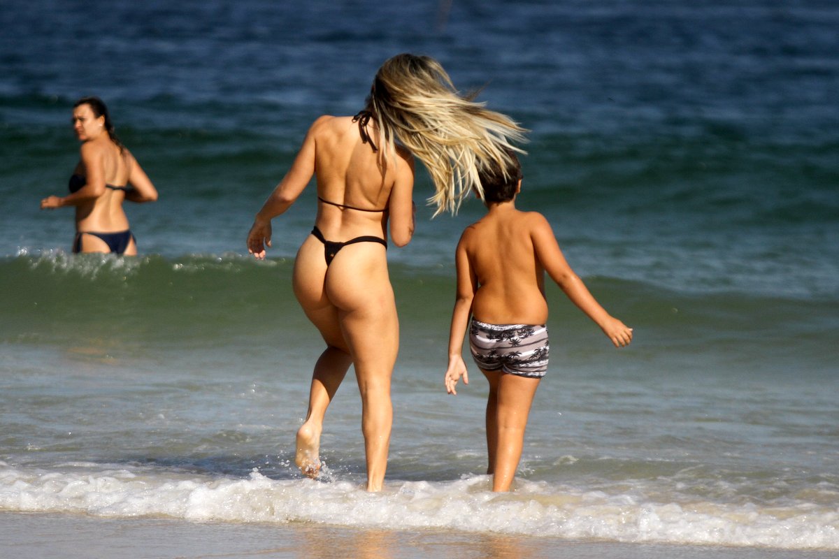 Andrea de Andrade resolveu tirar o dia para brincar na praia com o filho, Rinaldo, de 7 anos. Enquanto se divertia com o garoto na Praia da Barra da Tijuca, no Rio de Janeiro, o que chamou a atenção dos marmanjos e fotógrafos de plantão foi o fio-dental da loira de 27 anos.