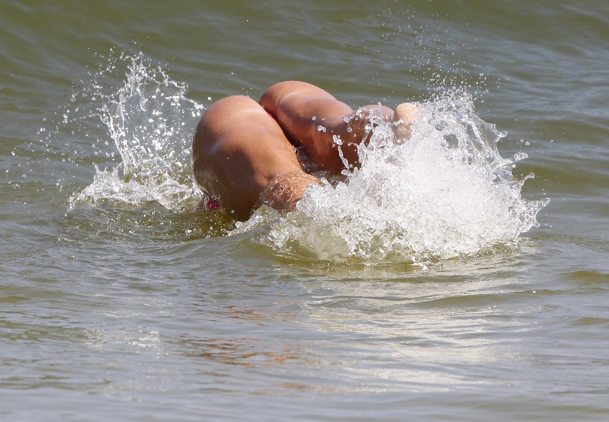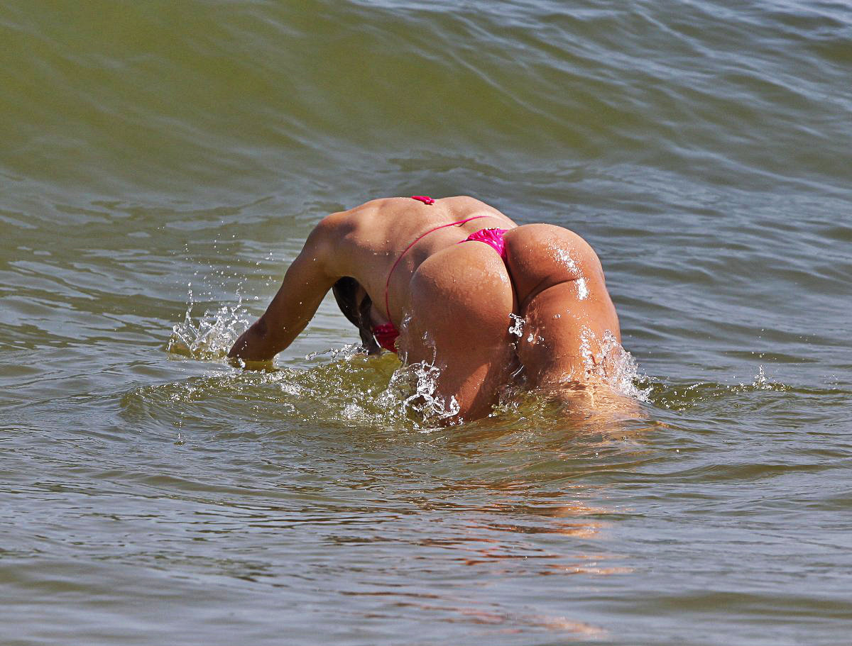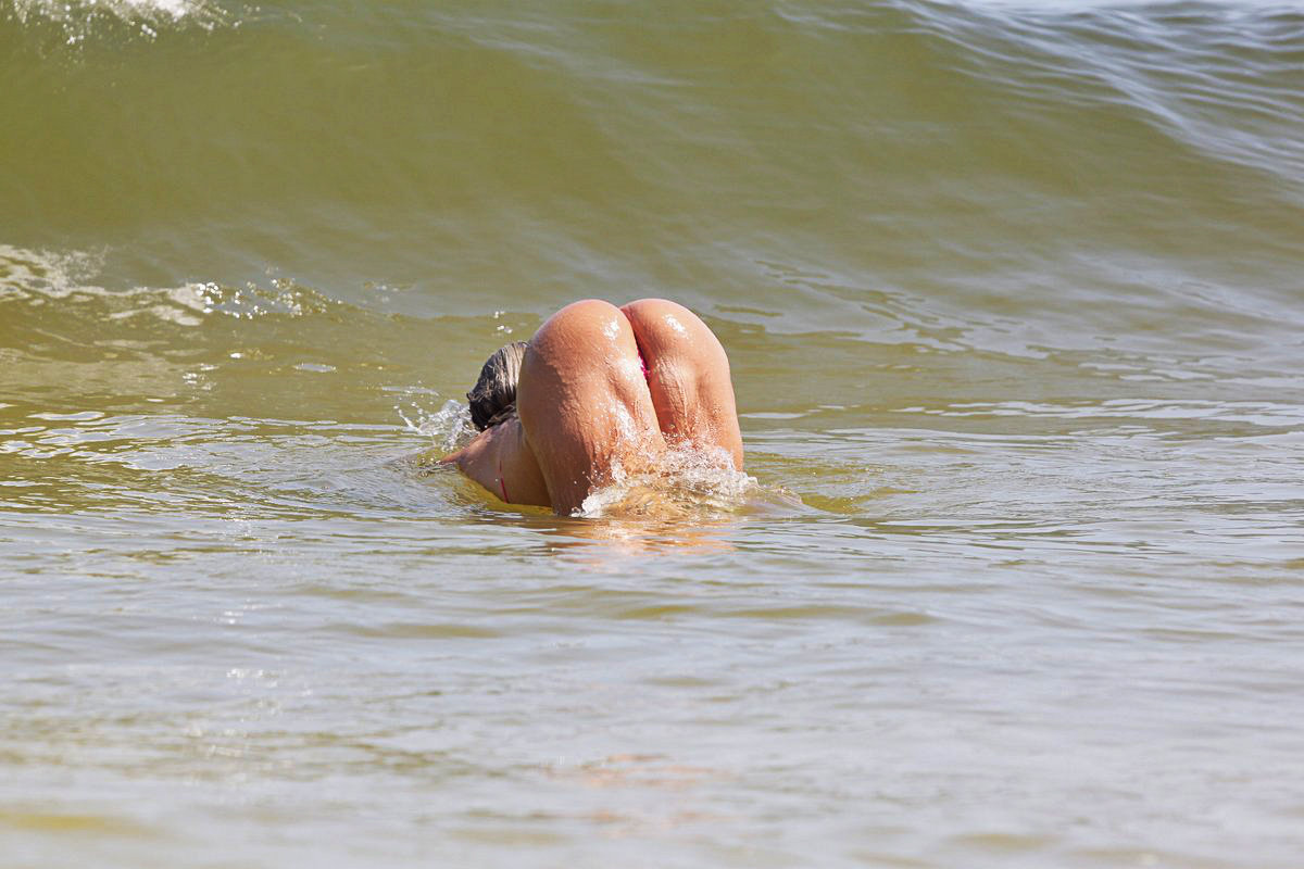 Os marmanjos que estavam na praia da Barra da Tijuca limparam a vista com a visão da loira em um microscópico biquíni rosa e fio-dental, que praticamente deixou sua derrière à mostra.