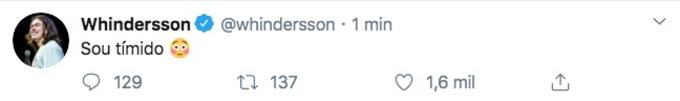 "Botei meu neném pra dançar hahaha", disse ela no Twitter. Whindersson, que aparentemente ficou tímido ao dançar, também comentou o episódio: "Acompanhei a patroa nesse carnaval todo, muita onda viu até me botou pra dançar! Kkkkk". Em seguida, admitiu: "Sou tímido".