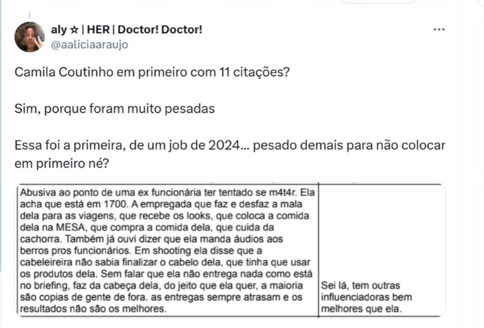 "Insano. Eu não sou de fomentar o cancelamento mas essa aí, ela não pede, ela implora! Simplesmente não cumpre agenda, não respeita o briefing e se ela quebrou a unha no dia da postagem, esquece!É luto pela unha quebrada e lá sabe deus quando será postado. Fecha o olho e vai".
