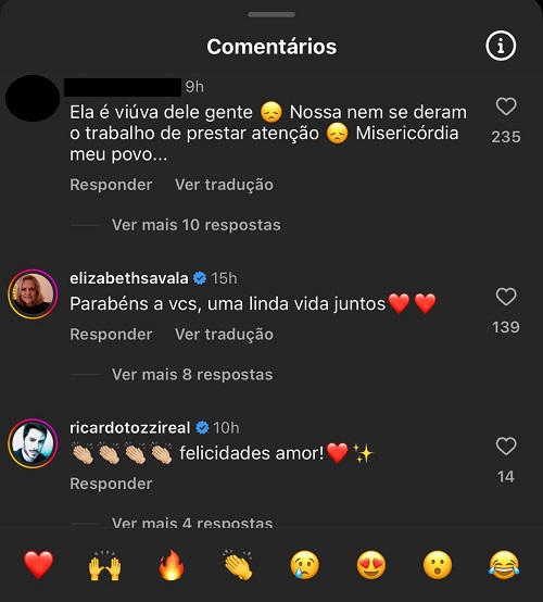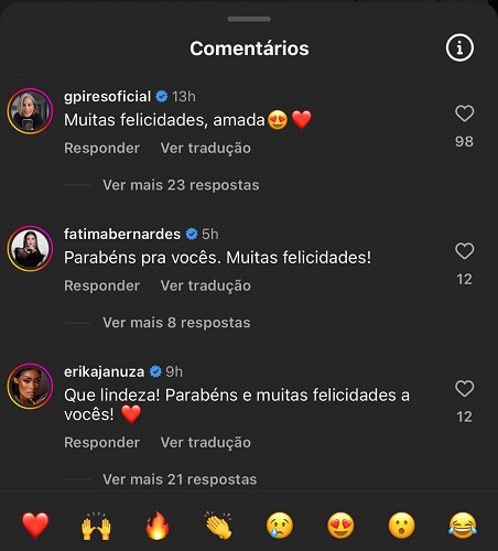 "Que lindos! Muito amor e felicidade para vocês", escreveu Helena Ranaldi. "Parabéns! Seja muito feliz", postou a apresentadora Adriane Galisteu. "Felicidades", afirmou o ator Carmo Dalla Vecchia.